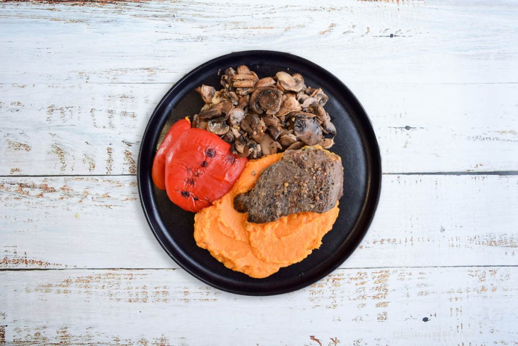 AAA Ny striploin), steak spices, yam mash (yams, olive oil), red bell pepper, mushrooms, herbs & spices