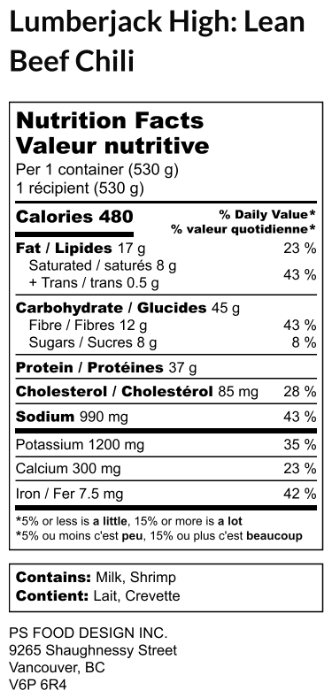 Lean ground beef slow cooked with hearty bean medley, jalapeño, fire roasted tomatoes, red bell pepper and your favourite warming chili spices, topped with feta cheese
