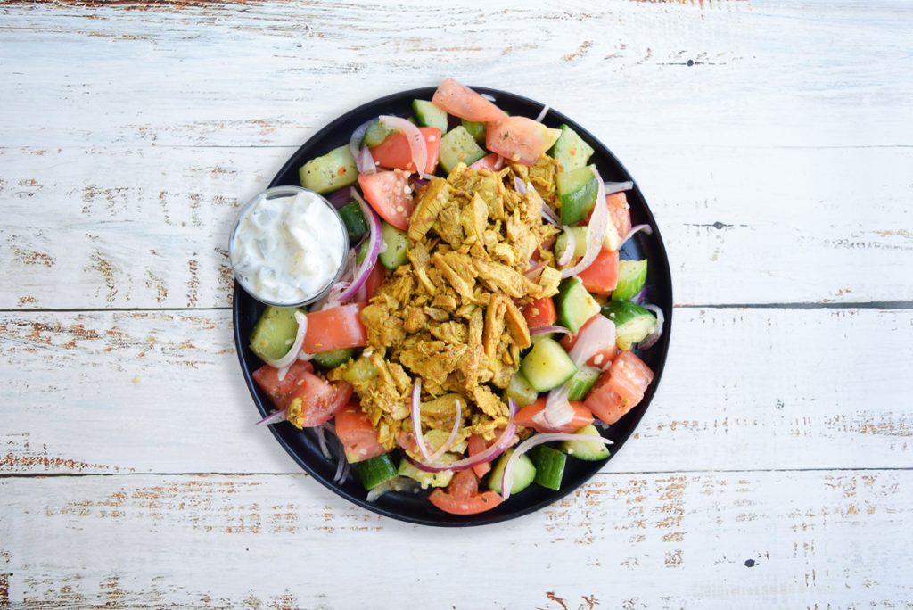 Chicken thigh, onion powder, cumin, turmeric, cayenne pepper, cinnamon, cardamom, olive oil, salt, onion, garlic, pepper, filtered water, parsley, house made tzatziki hummus (chickpeas, salt, garlic, tahnini, Greek yoghurt, lemon juice, dill, cucumber, olive oil, pepper), tomato, cucumber, kalamata olives, red onion, herbs & spices