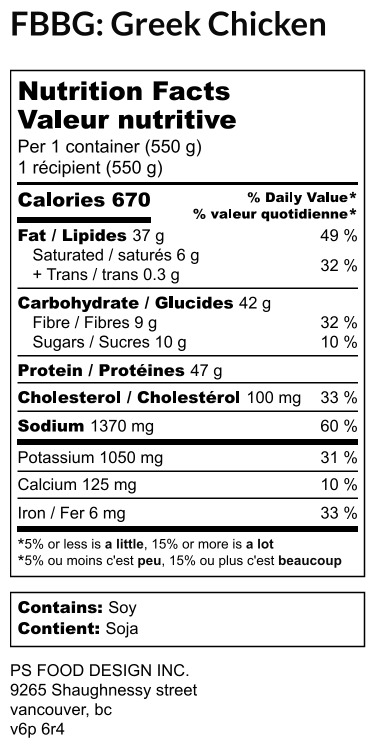 Chicken breast, Greek marinade (olive & soybean oil, filtered water, feta cheese, vinegar, red wine vinegar, salt, black olives, onion, garlic, lemon juice, xanthin gum), green beans, black pepper, mushrooms, organic tricolour quinoa, herbs & spices