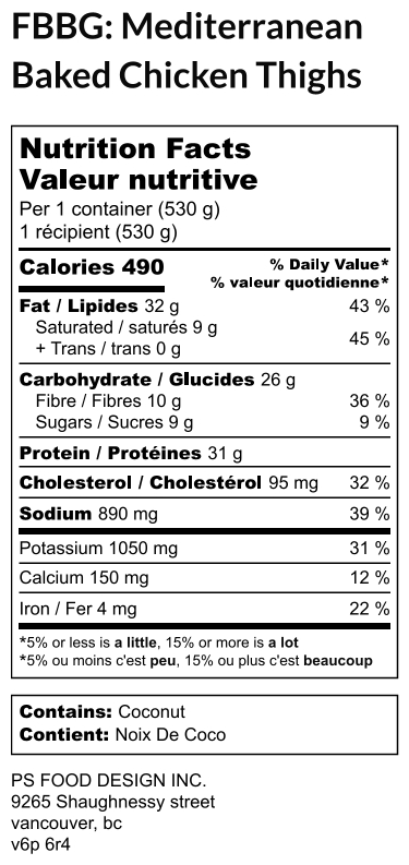 Mediterranean baked chicken thighs, marinated in an aromatic blend of paprika, garlic, allspice, nutmeg, fresh lime & fresh herbs, served over seasonal veggies with house made coconut-dill sauce