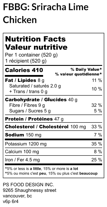 Chicken breast, sriracha lime seasonings, organic tricolour quinoa, broccoli, zucchini, herbs & spices