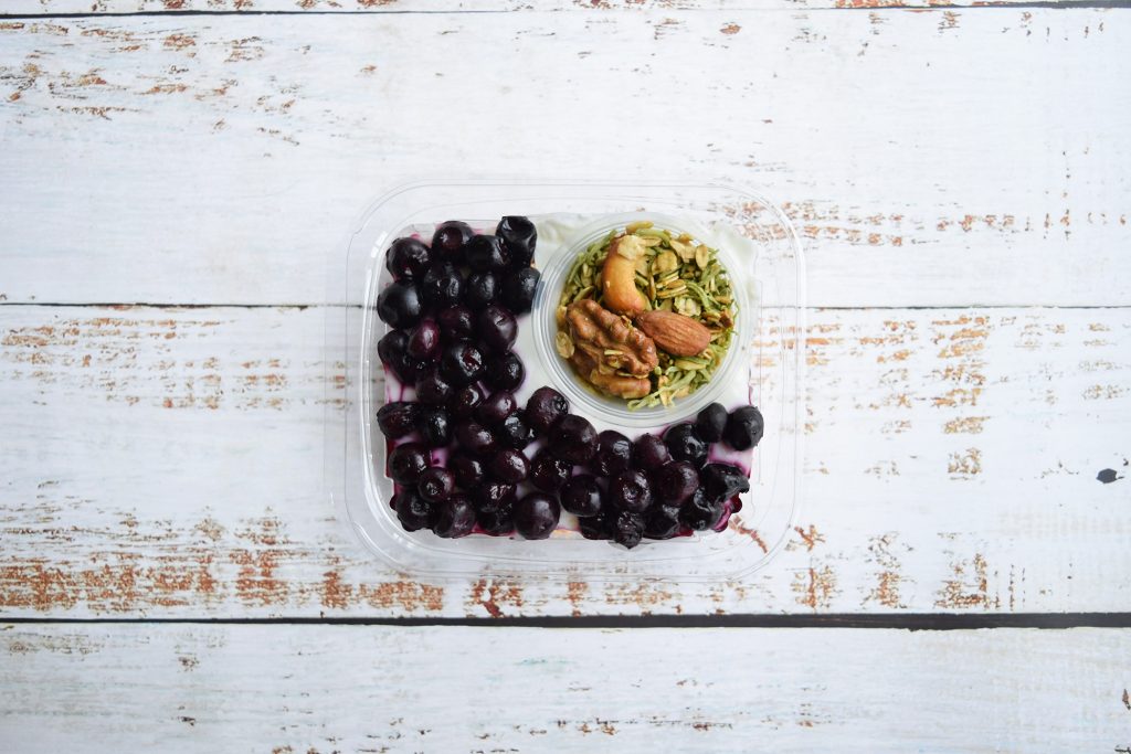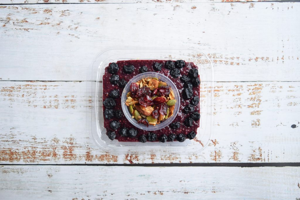 Antioxidant packed açai with blueberries, raspberries, organic chia, banana, vanilla and almond milk, topped with dried blueberries and our house made grain free granola