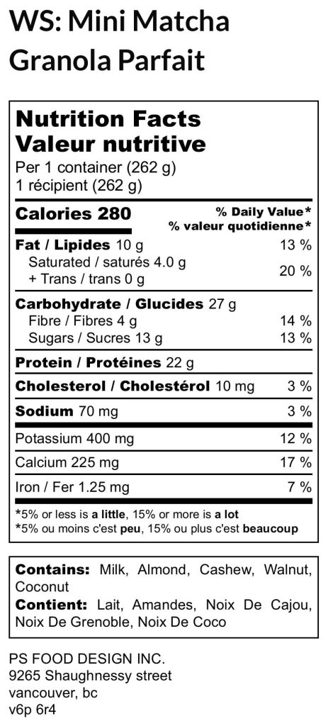 Organic gluten free oats, almonds, cashews, walnuts, organic coconut oil, shredded coconut, organic matcha powder, organic maple syrup, organic agave, vanilla extract, roasted berries, Greek yoghurt