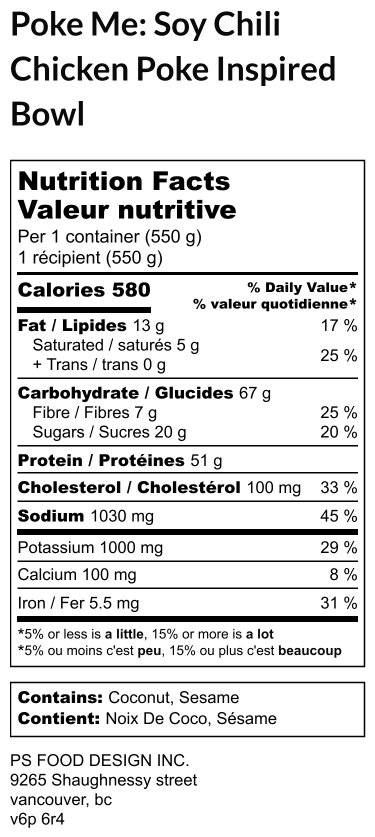 Sesame ginger marinated Rossdown chicken breast over coconut jasmine rice with fresh mango, radish, cucumber, edamame and our house made citrus garlic poke sauce