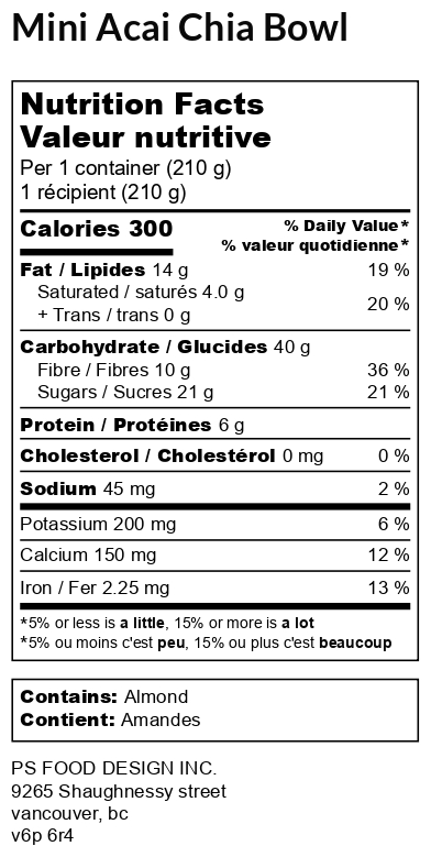 acai, organic unsweetened almond milk, blueberries, raspberries, chia seeds, banana, agave, vanilla, lemon juice, house made grain free granola (almonds, pumpkin seeds, sunflower seeds, cinnamon, vanilla, salt, xylitol, coconut oil, maple syrup, tapioca flour, coconut flour, shredded coconut, dried cranberries), dried blueberries