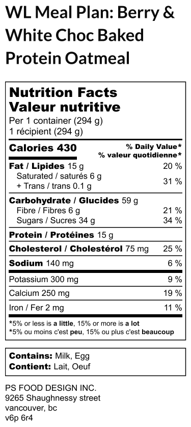 Organic gluten free oats, flax seed, organic chia seeds, baking powder, salt, eggs, oat milk, Greek yoghurt, vanilla, honey, whey isolate protein powder (whey protein isolate, natural flavours, sunflower lecithin, guar gum, stevia leaf extract), white chocolate (sugar, cocoa butter, whole milk powder, soya lecithin, natural vanilla flavouring), blueberries, maple syrup