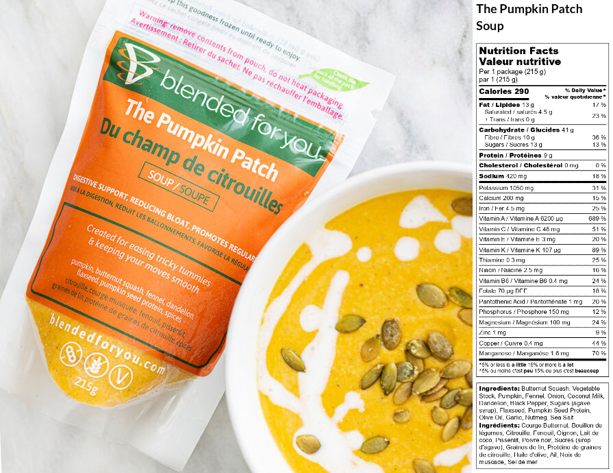 butternut squash, vegetable stock, pumpkin, fennel, onion, coconut milk, pumpkin seed protein, dandelion, black pepper, agave syrup, flaxseed, olive oil, garlic, nutmeg, sea salt.