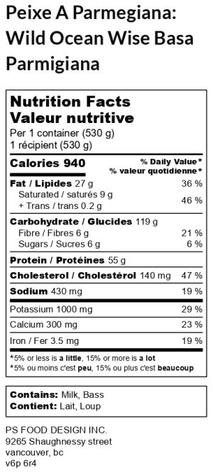 Hover For Ingredients Ocean wise basa, cornmeal, coconut milk, salt, pepper, gluten free pasta (corn flour, rice flour, mono and diglycerides of fatty acids), house made marinara (carrots, Spanish onion, olive oil, rosemary, basil, oregano, thyme, balsamic vinegar, organic raw coconut sugar, tomato puree, herbs & spices), mozzarella cheese, oregano0 out of 5$17.99Add to cart Login or Register to Buy -