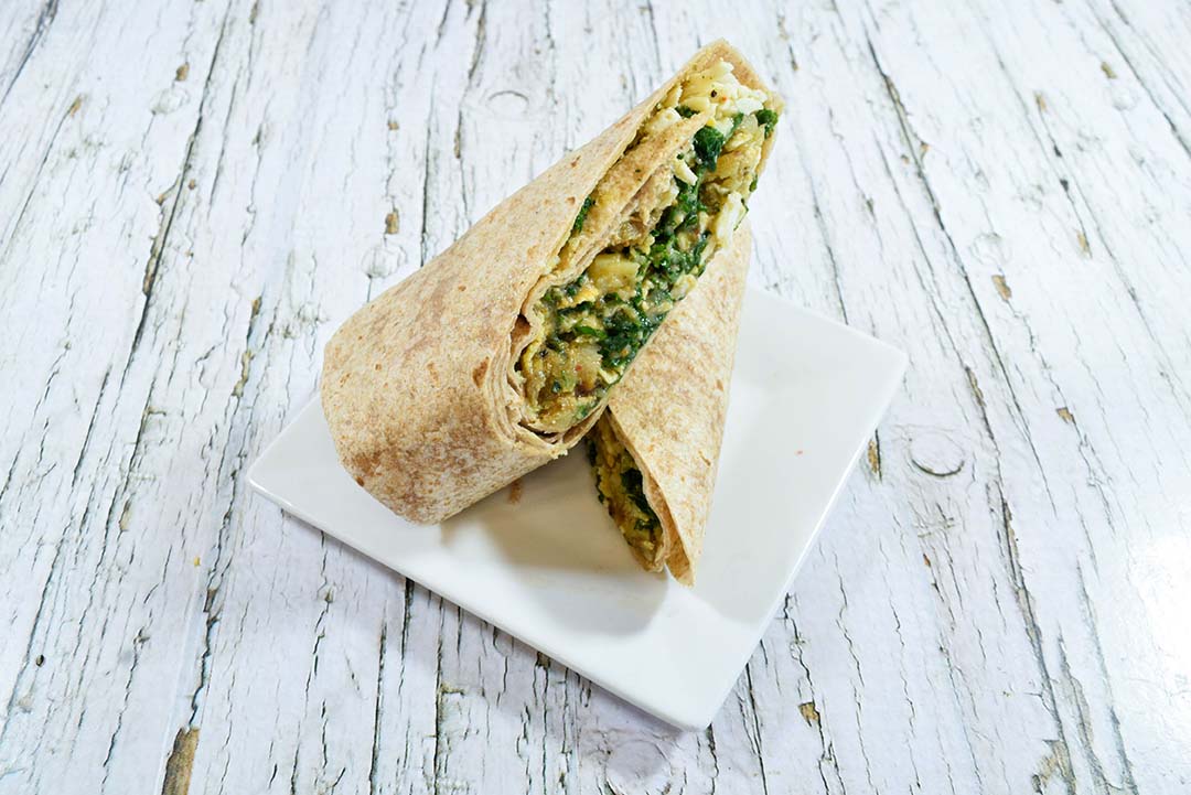 Free range egg tossed with baby kale, roasted golden potatoes, mozzarella cheese and salsa verde wrapped up in a delicious 12 inch whole wheat tortilla