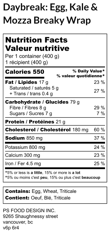 free range egg, kale, golden potatoes, salsa verde (tomatillos, filtered water, Serrano peppers, onion, cilantro, garlic, salt, sunflower oil, citrus, herbs & spices), mozzarella cheese, whole wheat tortilla (whole wheat flour, water, canola & modified palm oil, salt, sugar, baking powder, vegetable mono-and-di-glycerides, calcium propionate, fumaric acid, guar gum, potassium sorbate, enriched wheat flour, propylene glycol, modified cellulose)