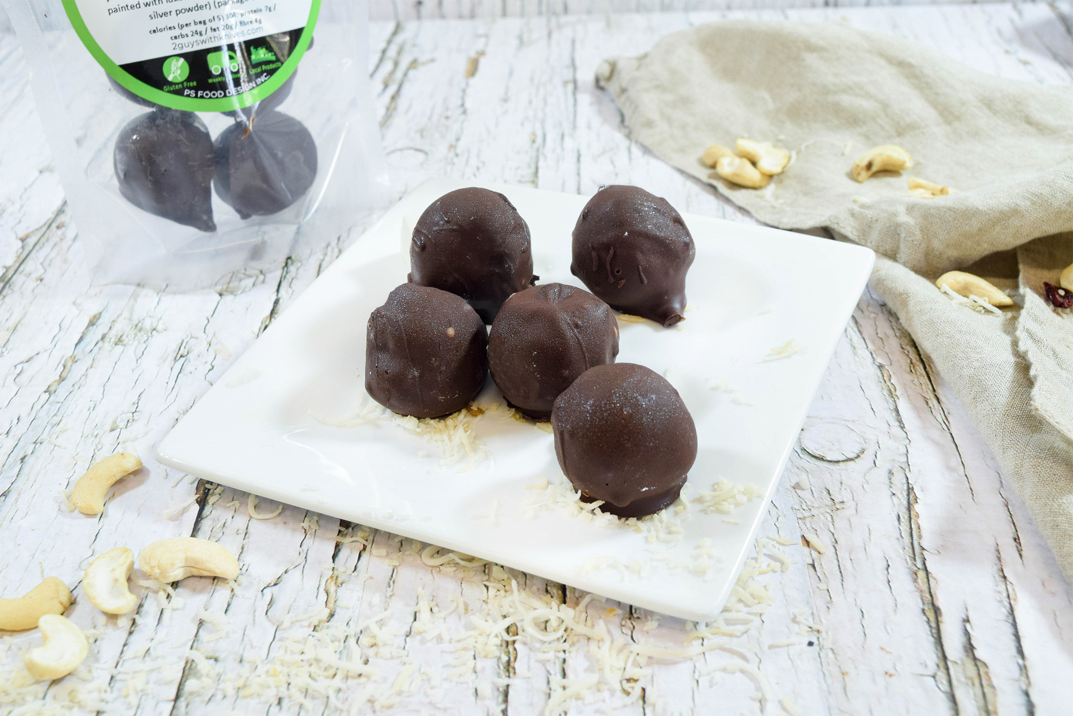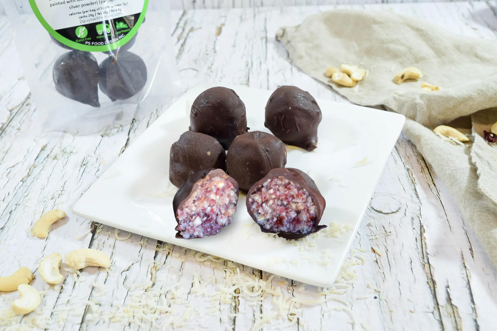 Raw cashews blitzed with shredded coconut, dried cranberries, vanilla & clean whey isolate protein, rolled in decadent dark chocolate (package of 5)