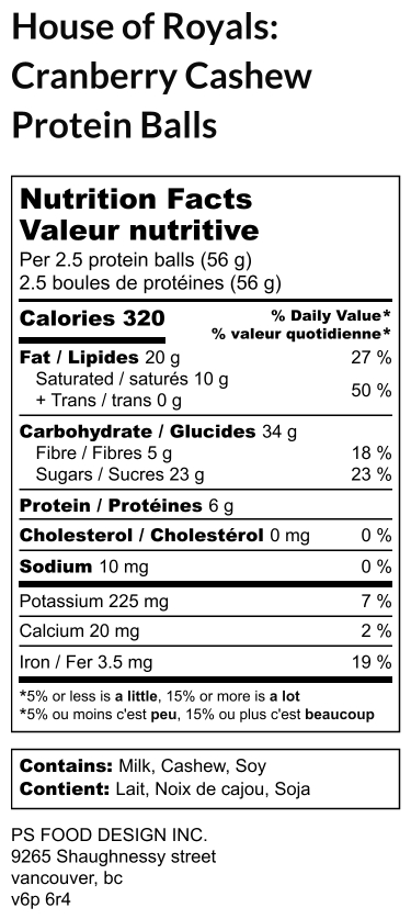 cashews, dried cranberries, shredded coconut, clean whey isolate protein, vanilla, dark chocolate (unsweetened chocolate; sugar; cocoa butter; soy lecithin, sunflower lecithin, canola lecithin; natural vanilla flavour)