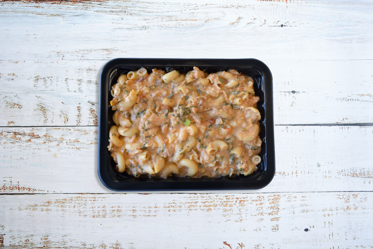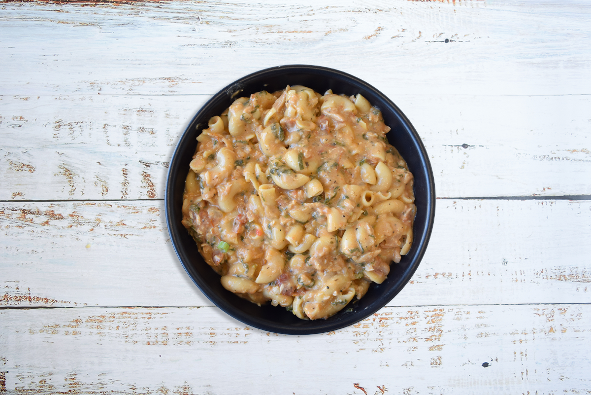 Rossdown halal chicken breast slow cooked with creamy coconut, sun-dried tomatoes, fresh garlic, Italian seasonings, spinach, gluten free elbow pasta and shredded parmesan