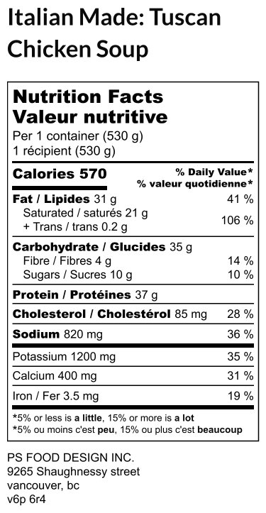 Rossdown halal chicken breast, olive oil, onion, sun-dried tomatoes, tomato paste, garlic, filtered water, Italian seasonings, salt, black pepper, gluten free macaroni pasta (white rice flour, brown rice flour, corn flour, quinoa flour, mono and diglycerides), spinach, coconut milk, parmesan cheese