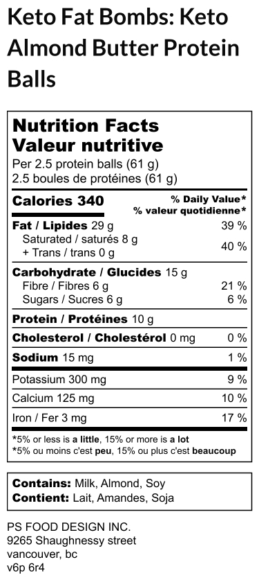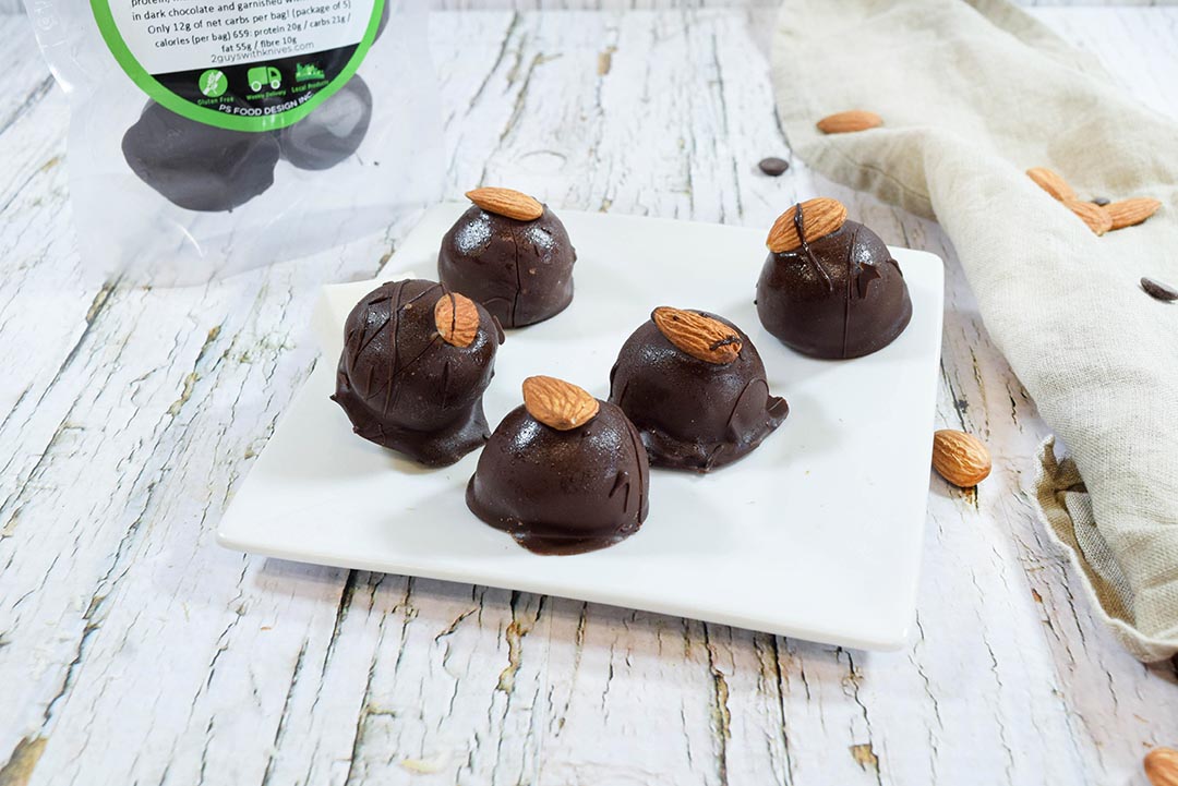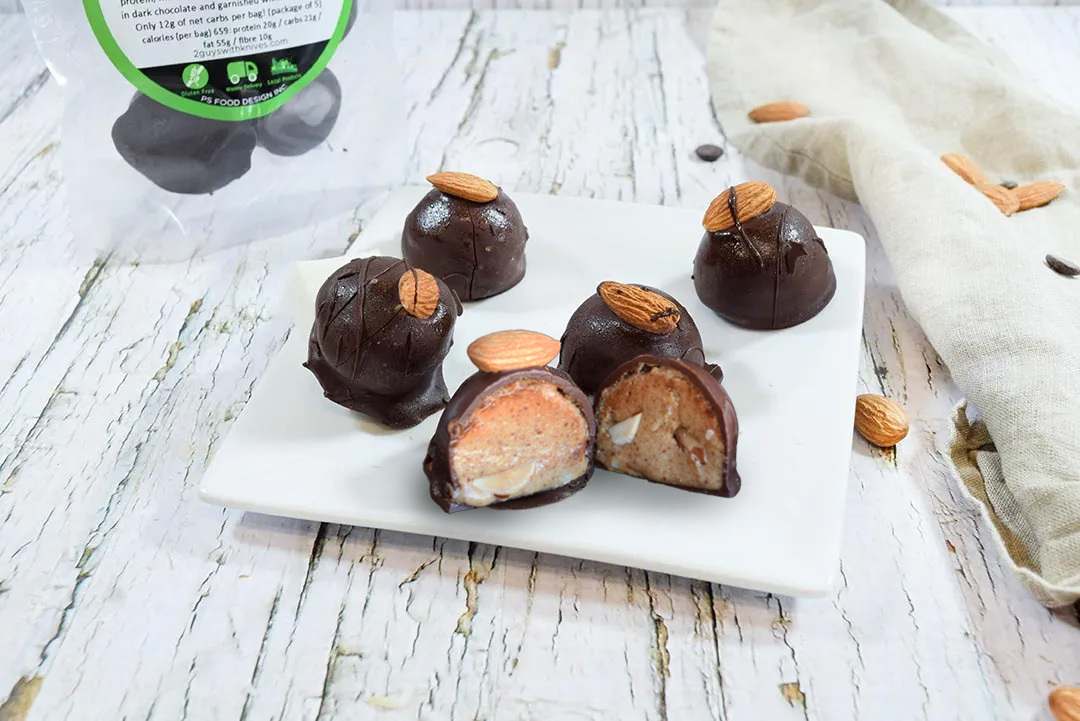 Healthy fat packed almond butter rolled with organic coconut oil, clean whey isolate protein, monk fruit & organic coconut flour dipped in dark chocolate and garnished with raw almonds. Only 12g of net carbs per bag! (package of 5)