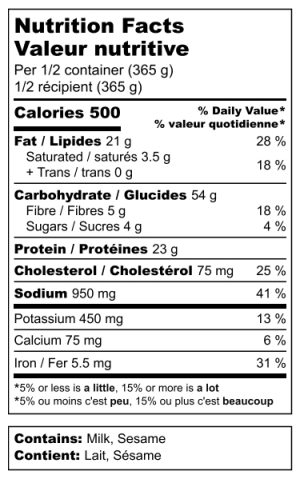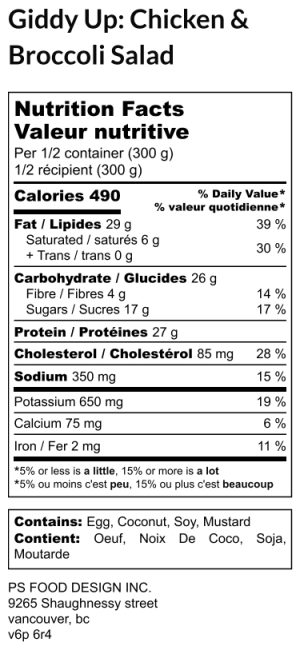 Hover For Ingredients Rossdown Halal chicken breast, broccoli, pork bacon, red onion, dried cranberries, sunflower seeds, coconut sugar, white vinegar, light mayonnaise (water, soybean oil, modified cornstarch, sugar, corn, maltodextrin, liquid whole egg, vinegar, salt, liquid egg yolk, mustard, lactic acid, potassium sorbet, phosphoric acid, dried onion, dried garlic, calcium disodium EDTA, spice)4.86 out of 5$20.99 Customize Login or Register to Buy -