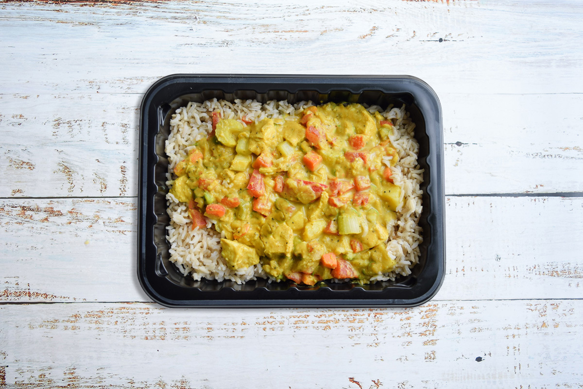 Tender Rossdown chicken breast simmered with creamy coconut milk, carrots, celery, red bell pepper, house made veggie stock and your favourite curry spices, served over brown jasmine rice