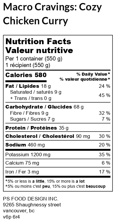 Rossdown halal Chicken breast, coconut milk, olive oil, onion, carrots, celery, garlic, gluten free flour (garbanzo bean flour, potato starch, tapioca flour, white sorghum flour, fava bean flour), house made veggie stock, golden potatoes, red bell pepper, curry powder, garam masala, salt, black pepper, herbs & spices
