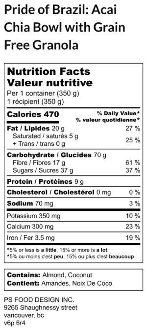 Hover For Ingredients acai, organic unsweetened almond milk, blueberries, raspberries, chia seeds, banana, agave, vanilla, lemon juice, house made grain free granola (almonds, pumpkin seeds, sunflower seeds, cinnamon, vanilla, salt, xylitol, coconut oil, maple syrup, tapioca flour, coconut flour, shredded coconut, dried cranberries), dried blueberries4.50 out of 5$12.49Add to cart Login or Register to Buy -
