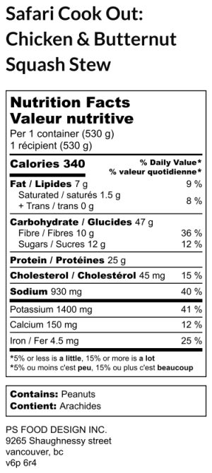 Hover For Ingredients Rossdown Halal chicken breast, carrots, celery, garlic, house made veggie stock, tomatoes, chickpeas, butternut squash, organic peanut puree, spinach, tomato paste, onion, salt, pepper, herbs & spices5.00 out of 5$13.99Add to cart Login or Register to Buy