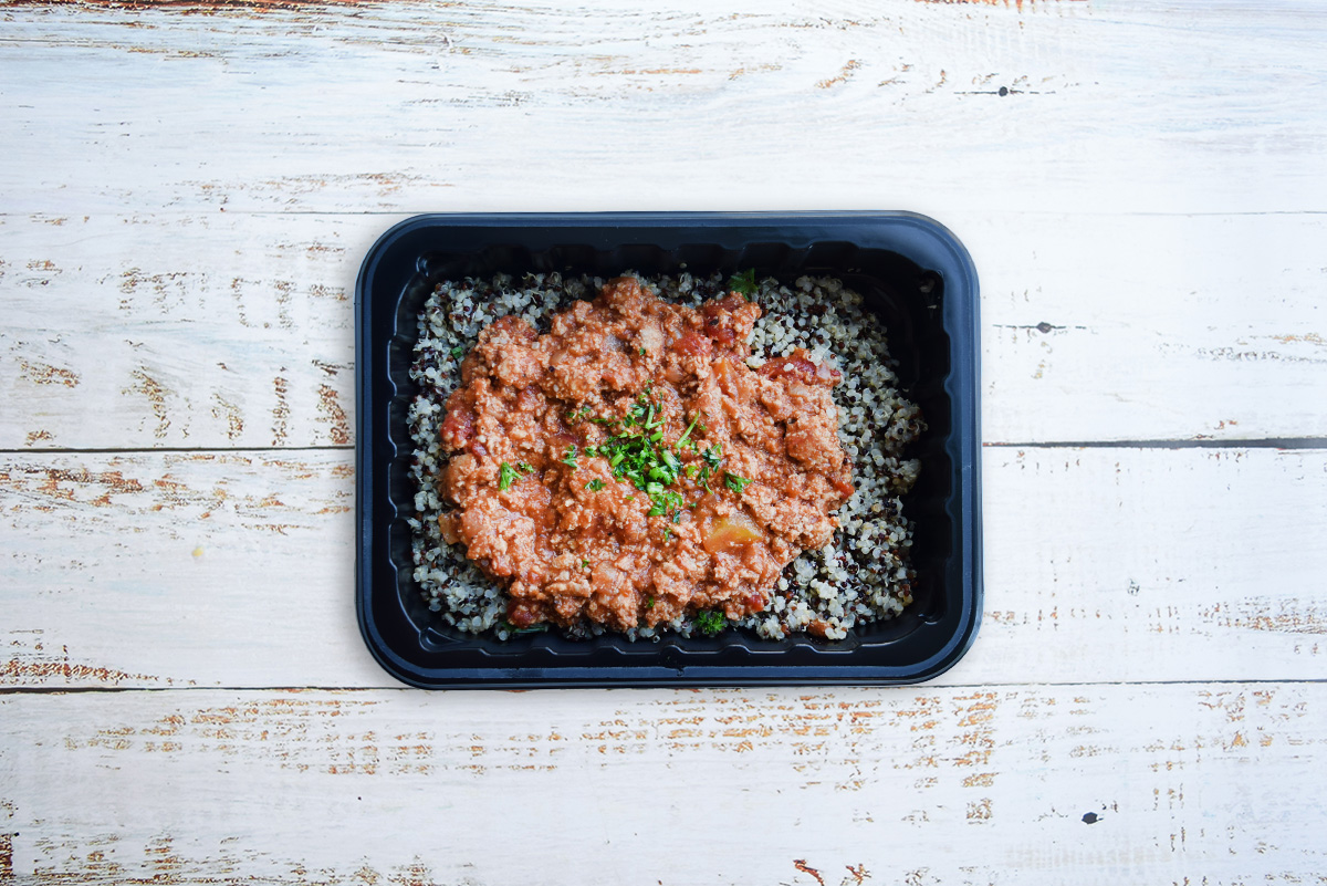 Lean ground turkey simmered with fresh tomatoes, Spanish onion & herbaceous spices over organic tri-colour quinoa