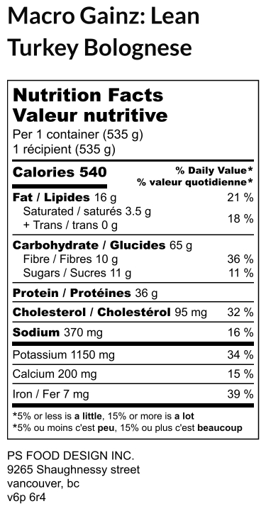 Lean ground turkey, organic tri-colour quinoa, fresh tomatoes, tomato paste, Spanish onion, garlic, black pepper, olive oil, herbs & spices