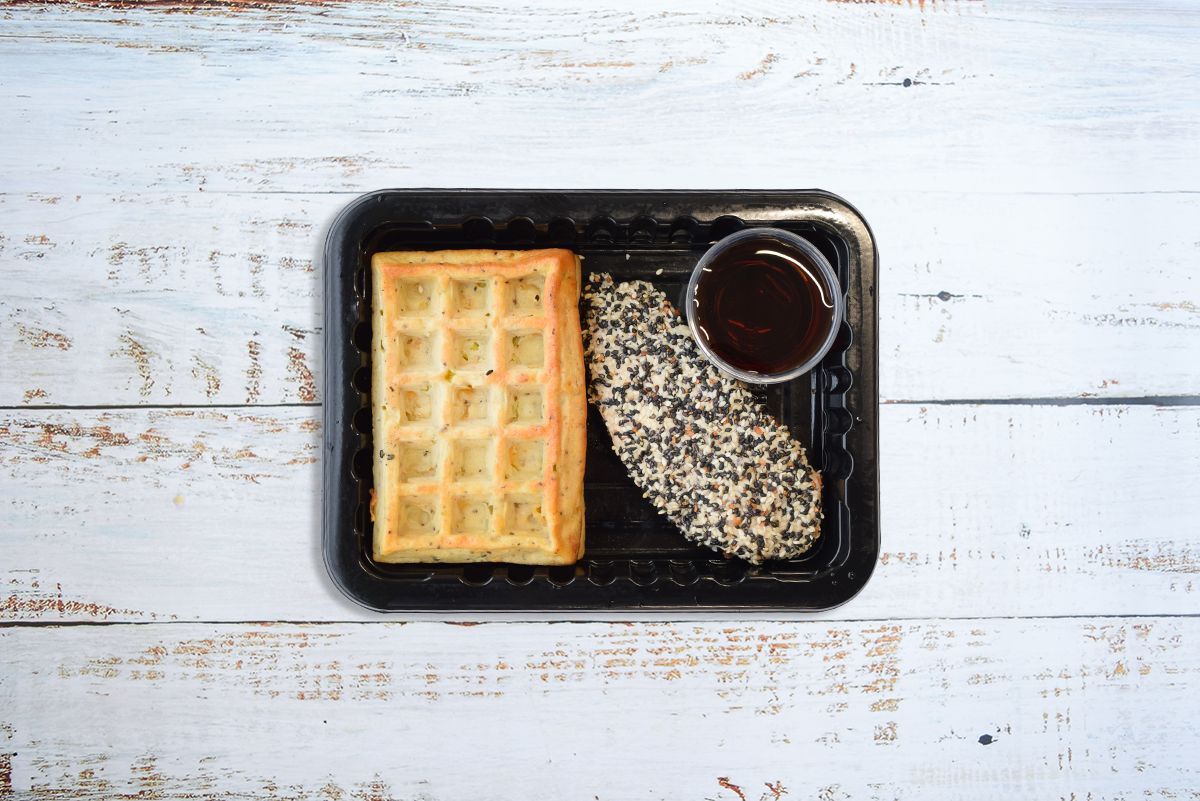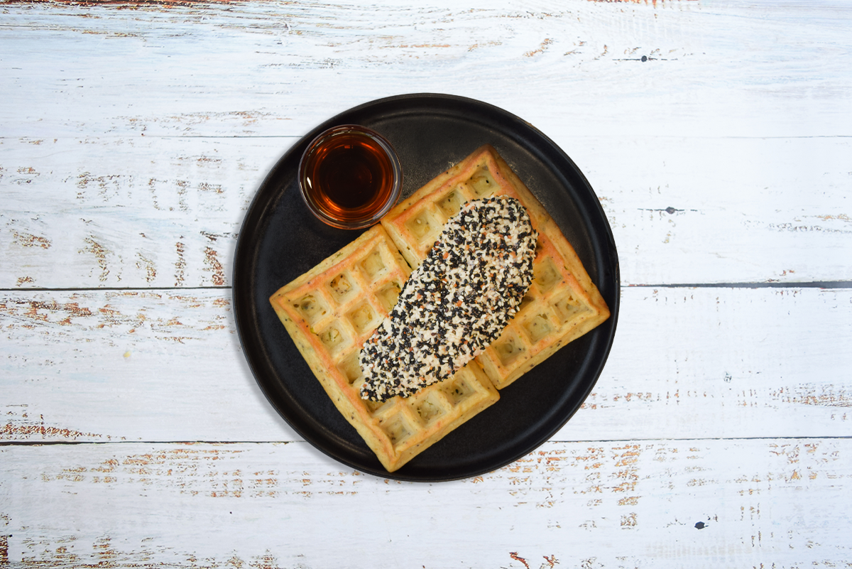 Sesame Crusted Baked Rossdown Chicken Breast served over our gluten free cheddar & Green onion waffles with maple syrup