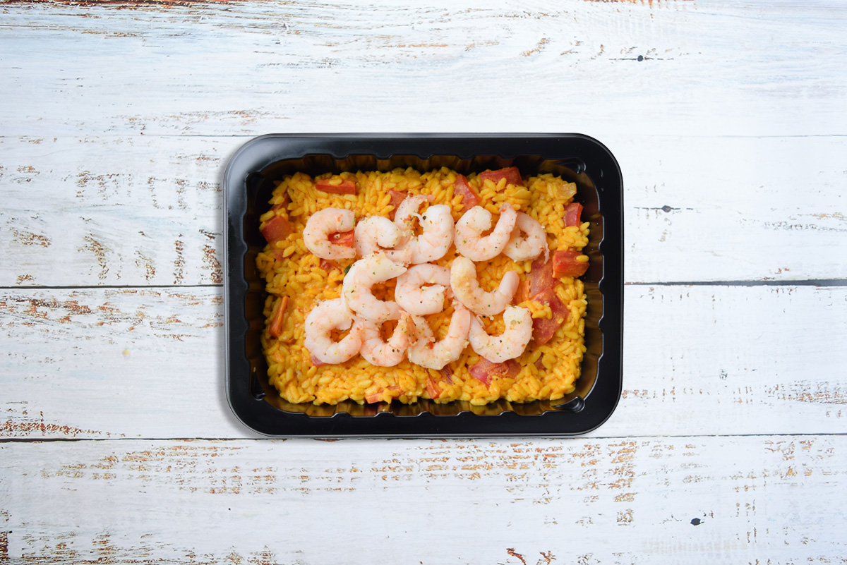 Shrimp, house made vegetable stock, olive oil, Spanish onion, garlic, ginger, arborio rice, Thai red curry paste (dried red chilli, lemongrass, garlic, shallot, salt, kaffir lime peel, galangal, spices, coriander seed, cumin powder), curry powder, fish sauce (anchovy extract 68%, salt, sugar), red bell pepper, coconut milk, salt, black pepper, basil, lime, vegan butter, ginger, herbs & spices