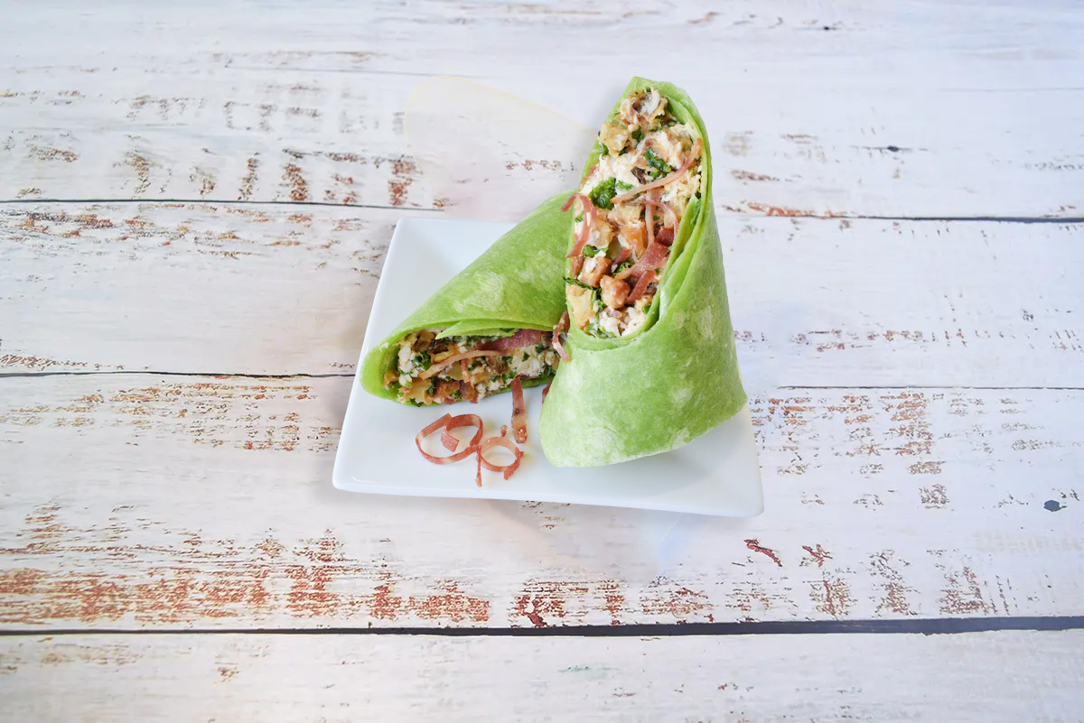 Baked Rossdown Halal chicken breast tossed with roasted sweet potatoes, hearty kale, oven roasted turkey bacon and our light chipotle aioli wrapped up in a 12 inch spinach tortilla