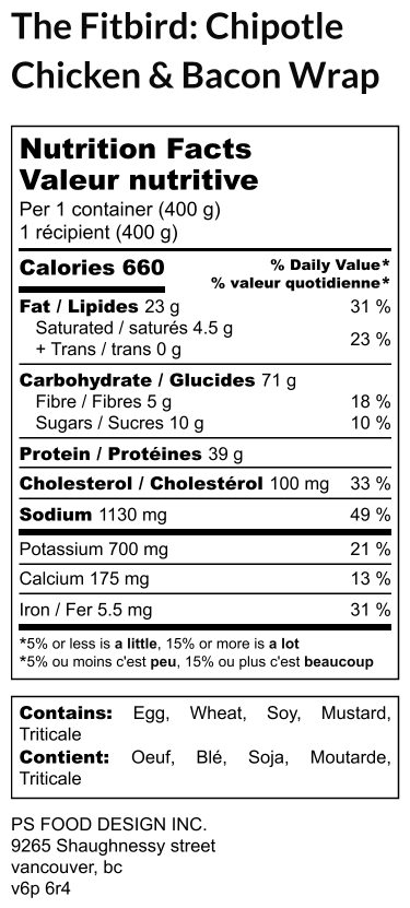 Rossdown Halal chicken breast, kale, sweet potatoes, chipotle peppers, filtered water, light mayonnaise (water, soybean oil, modified cornstarch, sugar, corn, maltodextrin, liquid whole egg, vinegar, salt, liquid egg yolk, mustard, lactic acid, potassium sorbet, phosphoric acid, dried onion, dried garlic, calcium disodium EDTA, spice), turkey bacon, spinach tortilla (enriched wheat flour, water, vegetable oil, rice flour, salt, sugar, spinach, baking powder, monoglycerides, calcium propionate, propylene glycol, fumaric acid, guar gum, potassium sorbate)