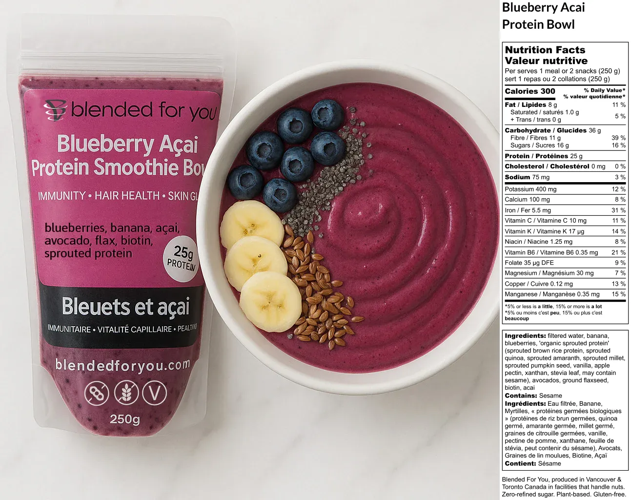 blueberries, banana, açai, avocado, flax, biotin, sprouted